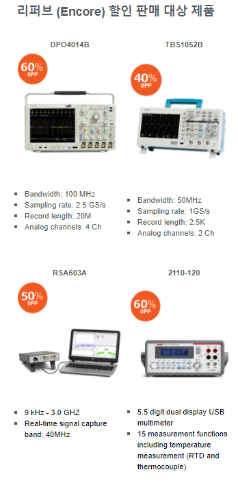 Tektronix Encore 즉, 리퍼브 제품은 공장 초과 재고, 반품, AS 등의 출처에서 공급됩니다. 그 후, Encore 제품은 공장 사양 (Factory Specifications)으로 재조정되어 고객 여러분들께서 텍트로닉스에 기대하는 것과 동일한 품질의 높은 표준을 충족합니다. 높은 품질 표준을 충족합니다.
